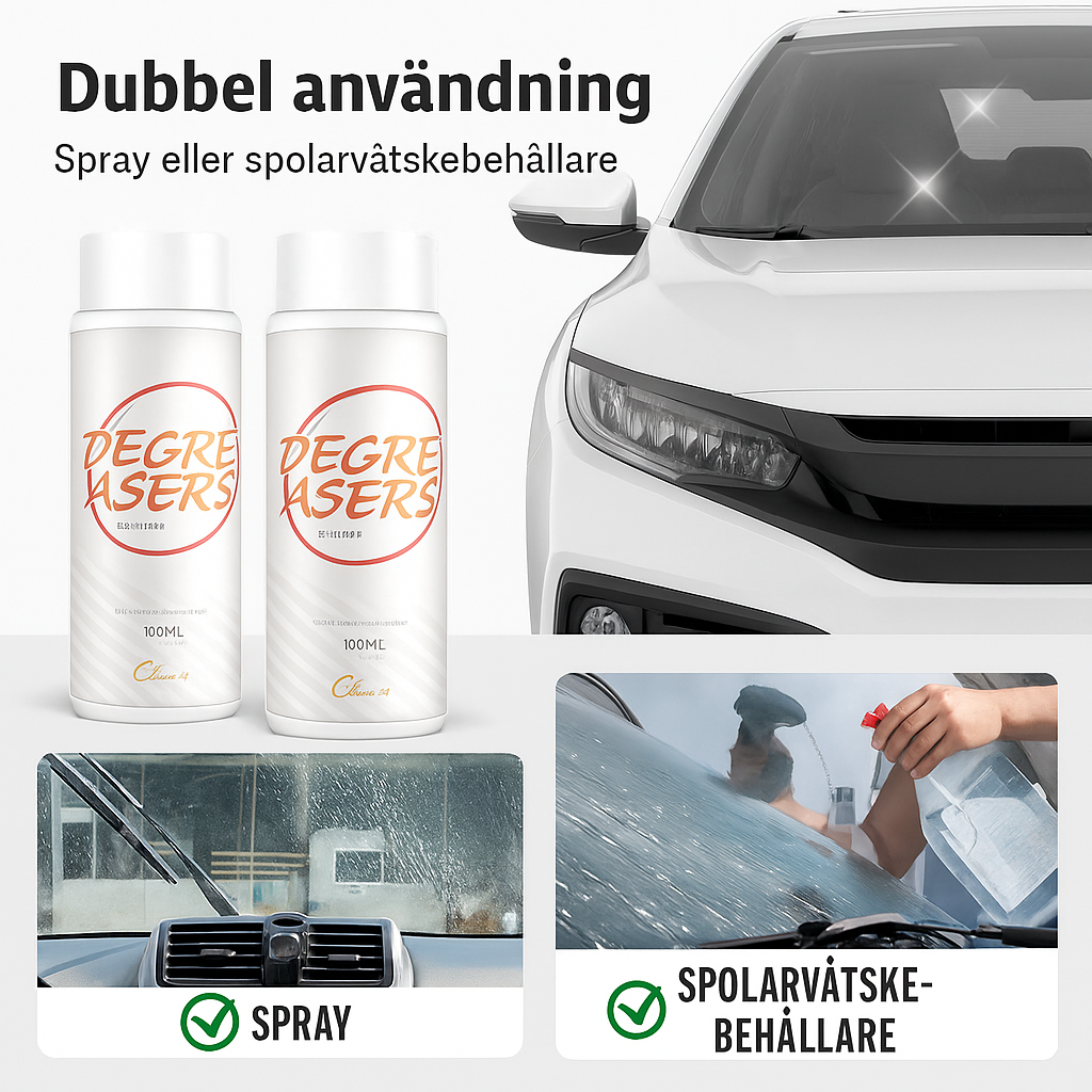 Formulan är giftfri, luktfri och skonsam mot både glas, lack och händer. Tillverkad av miljövänliga ingredienser, perfekt för dagligt bruk. Spraya direkt på ytan eller häll i spolarvätskebehållaren för enkelt underhåll.