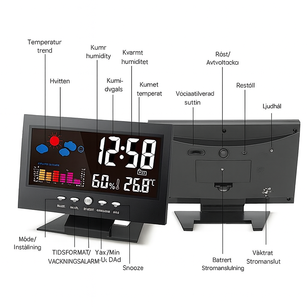 Het kleurrijke LCD-display zorgt voor een duidelijke en aangename aflezing, zowel overdag als ’s nachts. Wanneer het via USB wordt aangesloten, blijft de achtergrondverlichting continu aan; bij gebruik van batterijen schakelt deze automatisch uit na ongeveer 8 seconden. Het weerstation toont tijd, datum, maand en week en beschikt over een alarm- en sluimerfunctie. De klok kan worden ingesteld op 12- of 24-uurs weergave, zodat u alle informatie in één oogopslag hebt.