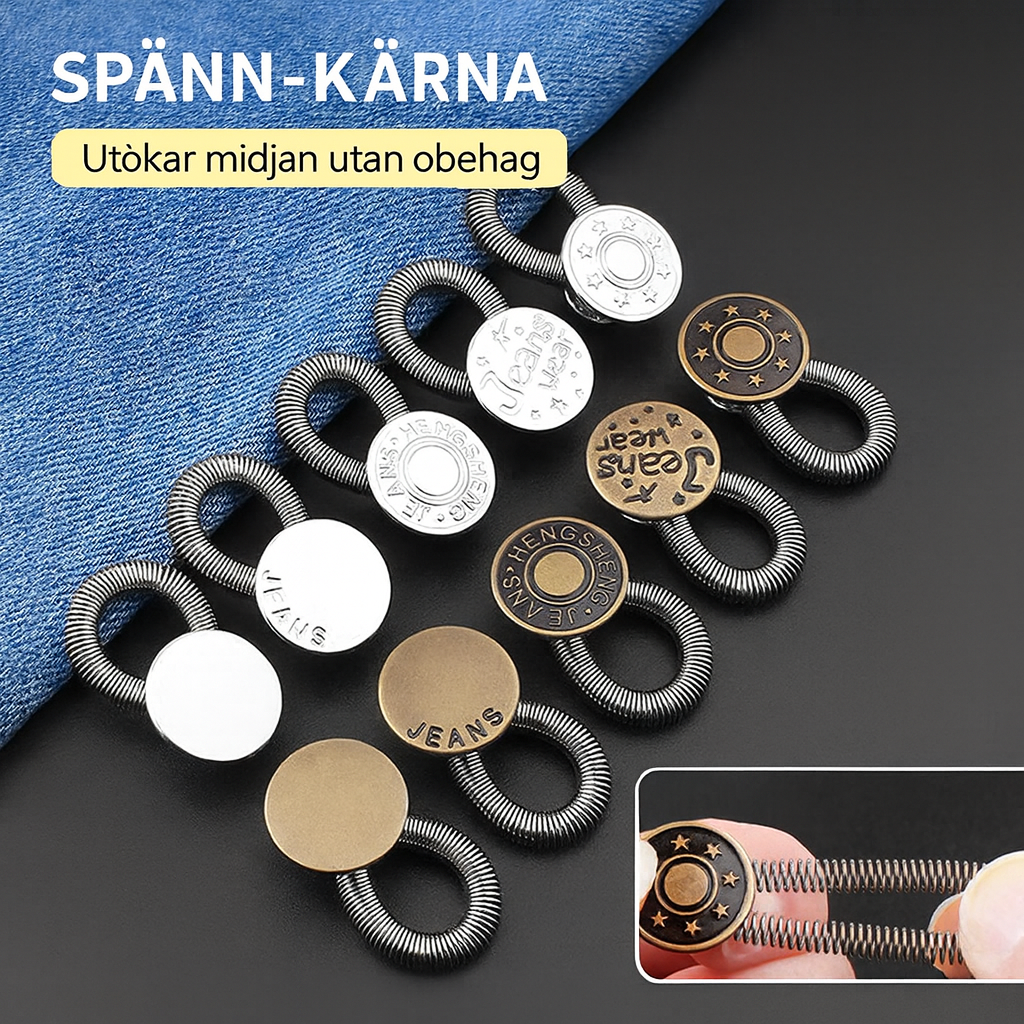 Denna smarta midjeförlängare med fjädermekanism anpassar sig automatiskt efter din kropp och ger en bekväm passform hela dagen. Perfekt när midjan känns lite för tight – den expanderar när du sitter, böjer dig eller rör på dig, utan att du behöver ändra eller sy om dina jeans.