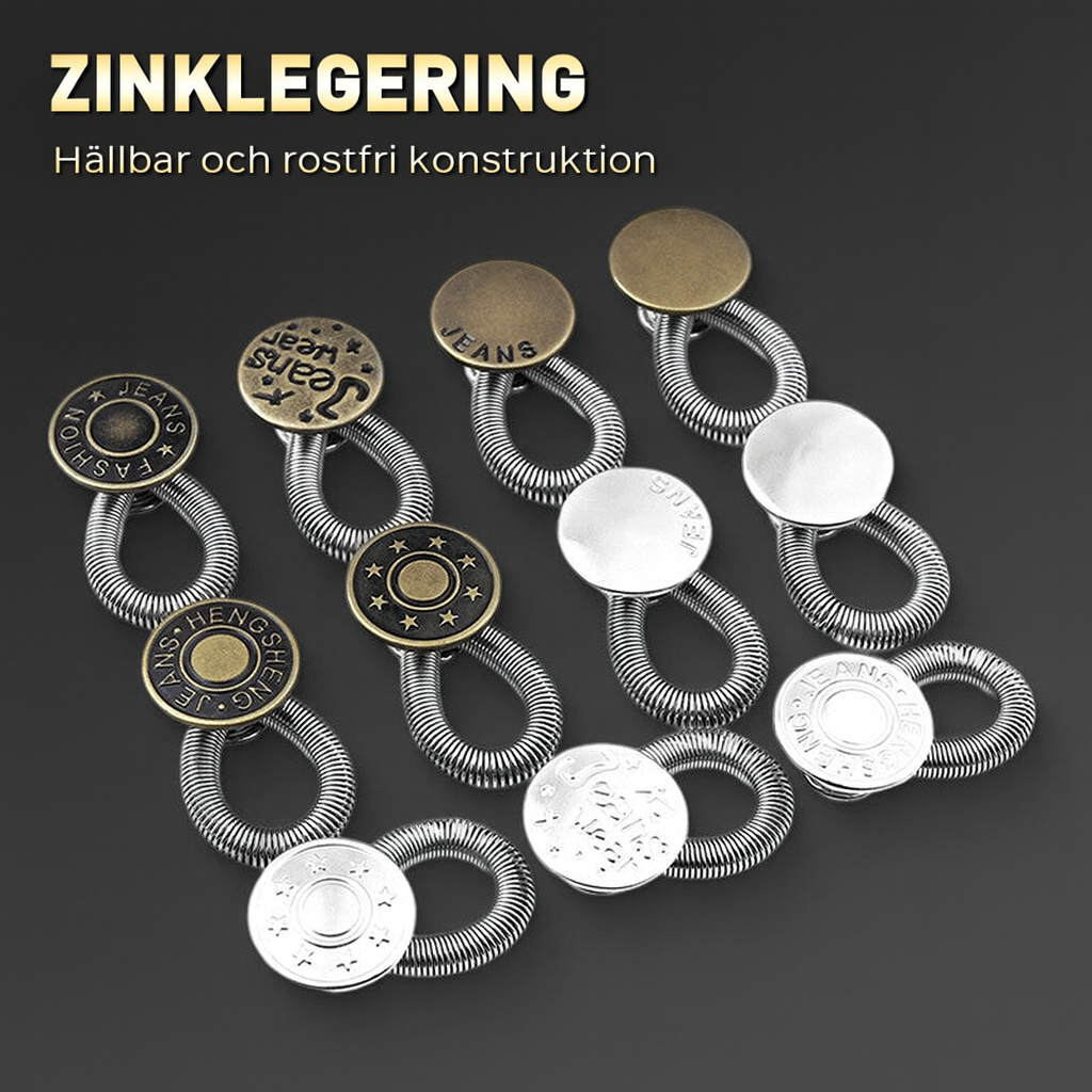 Tillverkad i rostfri zinklegering som motstår slitage och korrosion, vilket gör den perfekt för vardagsbruk. Den stilrena metallfinishen smälter in med de flesta jeans och byxor, utan att dra uppmärksamhet. Liten nog att bära med sig och återanvändbar – idealisk vid tillfälliga storleksförändringar, svullnad, graviditet eller återhämtning.