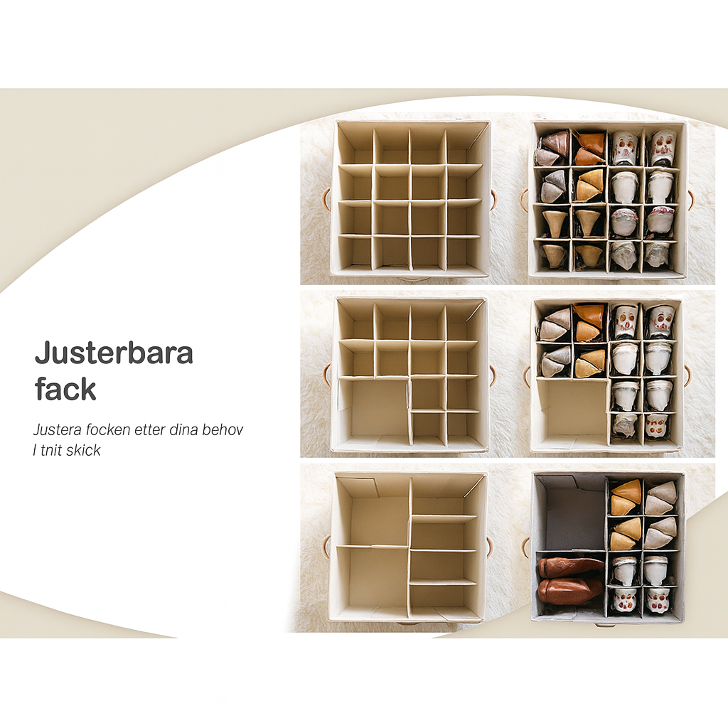Detta kompakta skoställ rymmer 6–12 par skor, oavsett om det är sandaler, sneakers eller ballerinor. Med sina 12 separata fack får du ordning, översikt och enkel åtkomst till varje par.