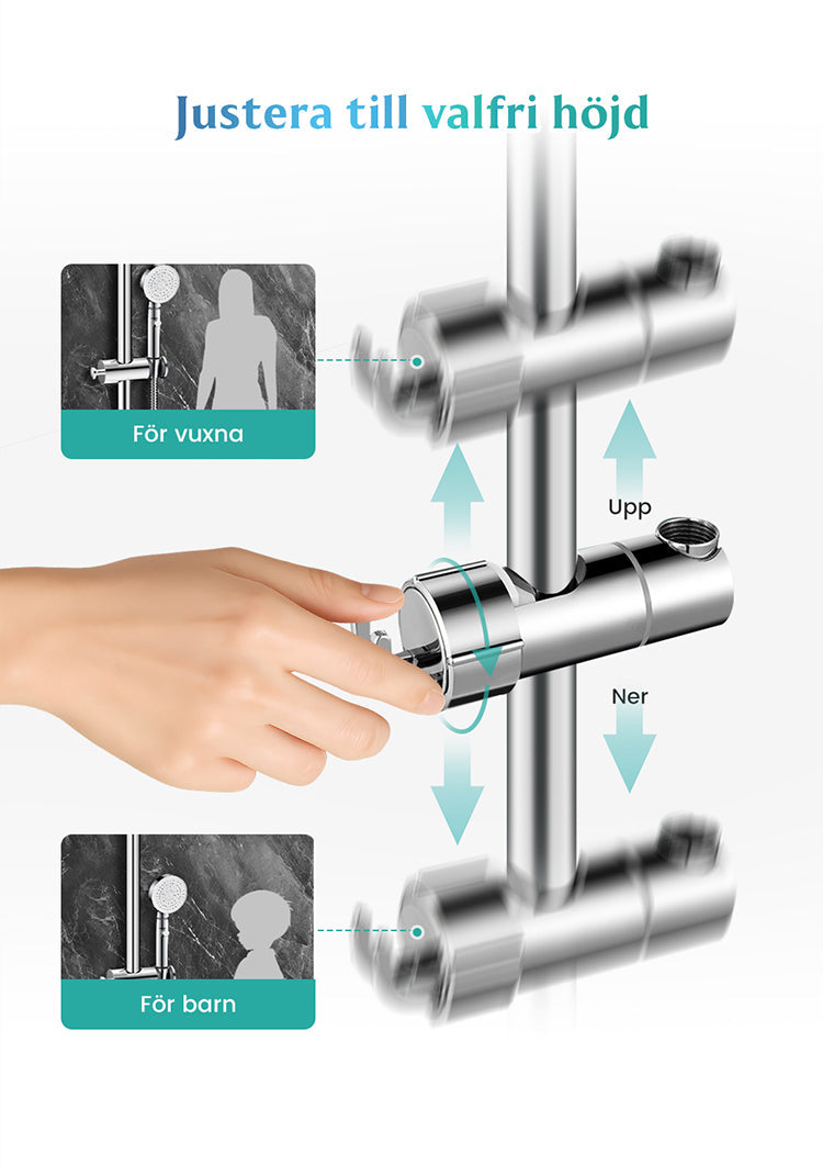 Med höjdjustering kan olika familjemedlemmar enkelt anpassa höjden, vilket gör den särskilt praktisk för barn. Dessutom kan hållaren roteras 360°, vilket ger full frihet att justera vinkeln för en bekväm duschupplevelse.