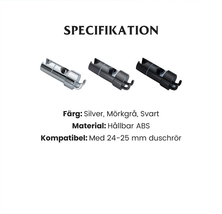 Detta duschhållare kräver ingen komplicerad montering – sätt fast och använd direkt. Passar universella storlekar (18–25 mm rundstång) och är kompatibel med de flesta duschstänger och spruthuvuden på marknaden.