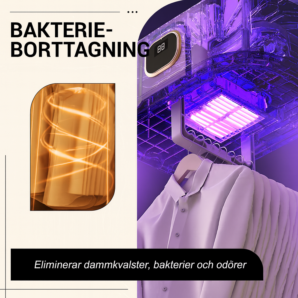 Den avancerade 360° varmluftscirkulationen torkar kläderna jämnt och snabbt utan fuktfläckar. Den varma luften hjälper dessutom till att eliminera bakterier och kvalster, medan den inbyggda jonteknologin neutraliserar dålig lukt – vilket ger rena, fräscha och hygieniska kläder varje gång.